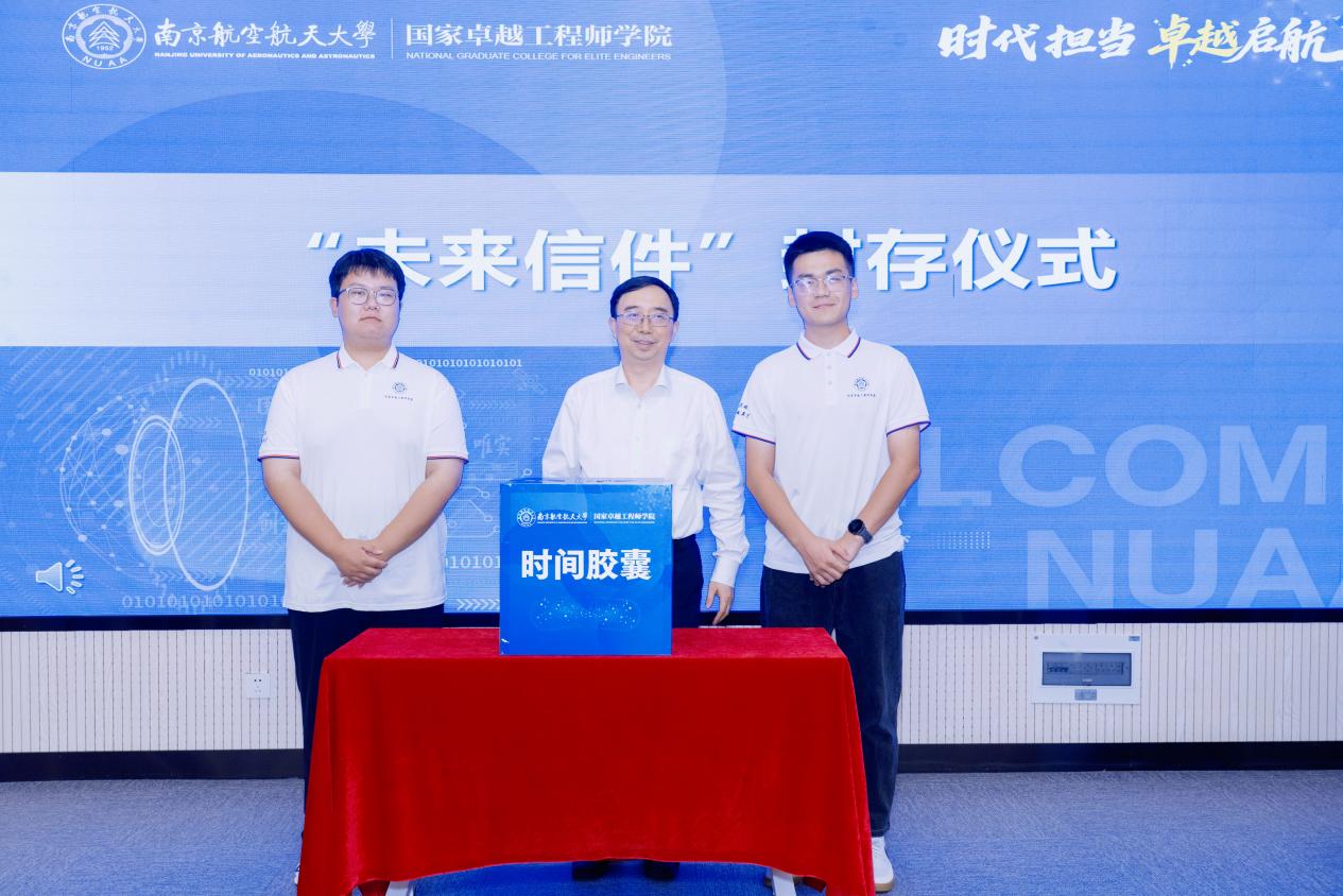开学前,学院为每位新生定制信封与信纸,同学们郑重写下对学成后的期盼,投入了“时间胶囊”信箱中。典礼现场,姜斌与学生代表共同将满载愿景的时间胶囊封存。这份特殊的青春礼物,既承载着学子初心,也寓意着在时间中坚守、在耕耘中成长,期待未来开启时与更好的自己重逢。